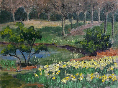 This week has been spring break from my painting class. It was nice for two days this week so I went out to paint. On Wednesday, I went to the Botanical Gardens cause I figured that some of the flowers would be in bloom. I wasn't disappointed; I found this bed of daffodils.